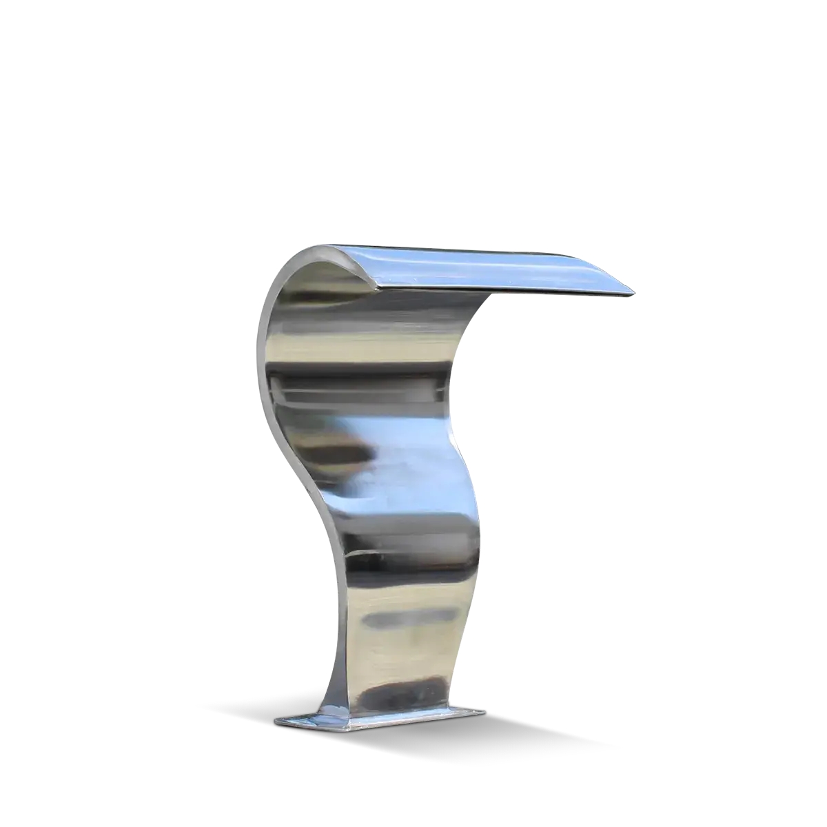 Cascada volumétrica Vulcano. Fabricada de AISI 304, pensada para ser colocada en la vereda con altura de 47 cm. Genera una lámina de agua vistosa y continua de 35 cm de ancho hasta el espejo de agua. Su terminación pulido brillante destaca y ofrece un distintivo ornamental para su piscina.