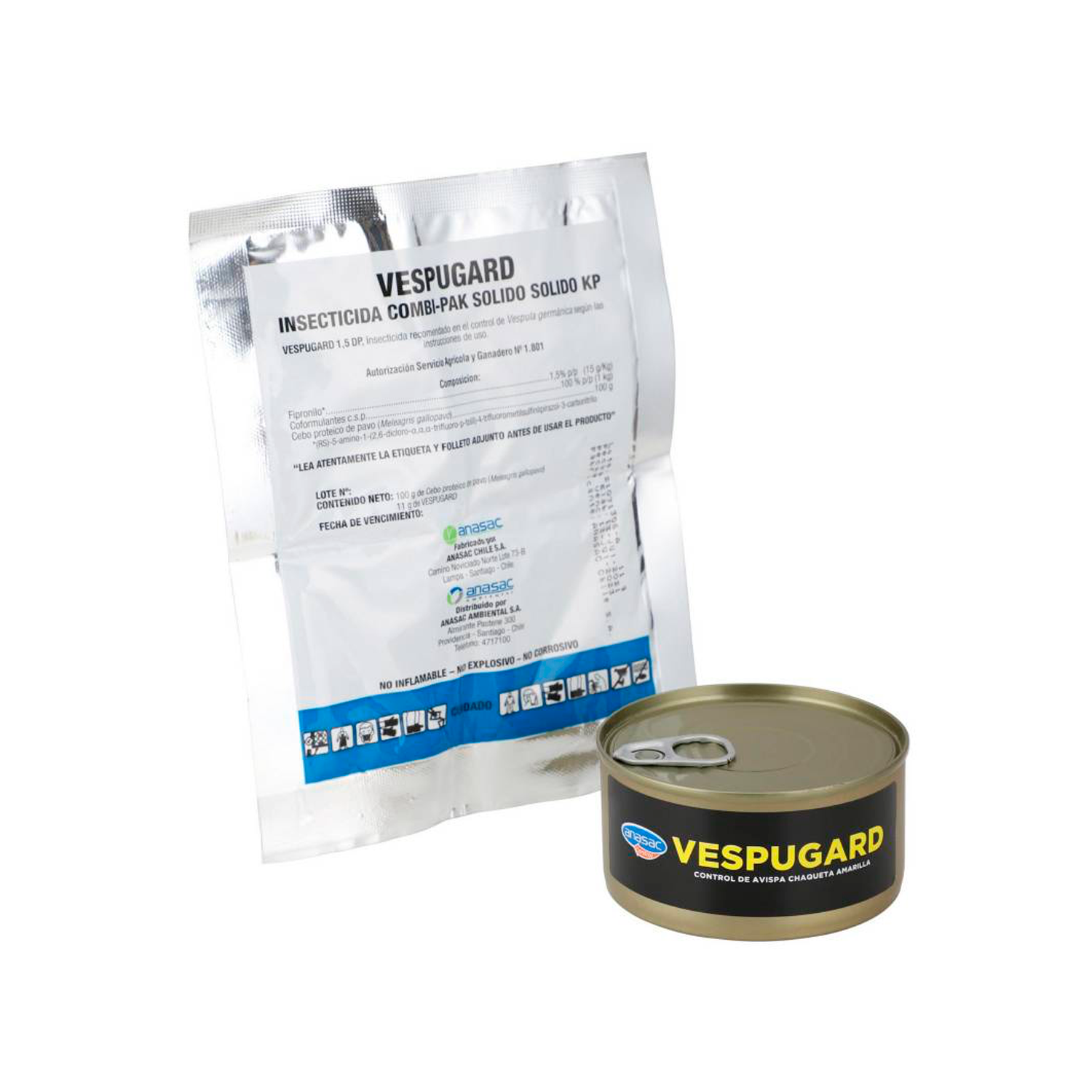 Características Vespugard es un novedoso y potente insecticida, de alta efectividad. Especial para el control de avispa chaqueta amarilla. La avispa que ingiere el cebo no morirá de inmediato, con esto transportará y diseminará el insecticida en todo el avispero. Forma de Uso Abra la lata que contiene el cebo. Abra cuidadosamente el envase de insecticida y mézclelo en la lata del cebo. Revuelva la mezcla (cebo + insecticida) con la bagueta incorporada en el kit hasta homogenizarla. Perfore el pre-picado de este envase de cartón y disponga la lata en su interior. Coloque el portacebo en exteriores colgando, a una altura que está fuera del alcance de los niños y de mascotas. Las avispas serán atraídas por el cebo y diseminarán el insecticida en todo el avispero, logrando un notorio control de la población a partir de las 48 horas. Precauciones Al aplicar usar guantes. No fumar, comer ni beber durante la aplicación. Después de aplicar lavarse con abundante agua y jabón. Evitar que el producto entre en contacto con la piel y ojos. Manténgase alejado de niños y animales domésticos. No almacenar junto a alimentos. Composicion Fipronil: 0,01 ml. Presentación Lata de 195 gr. de cebo 1 sobre de aluminio de 11 gr 1 bagueta para revolver