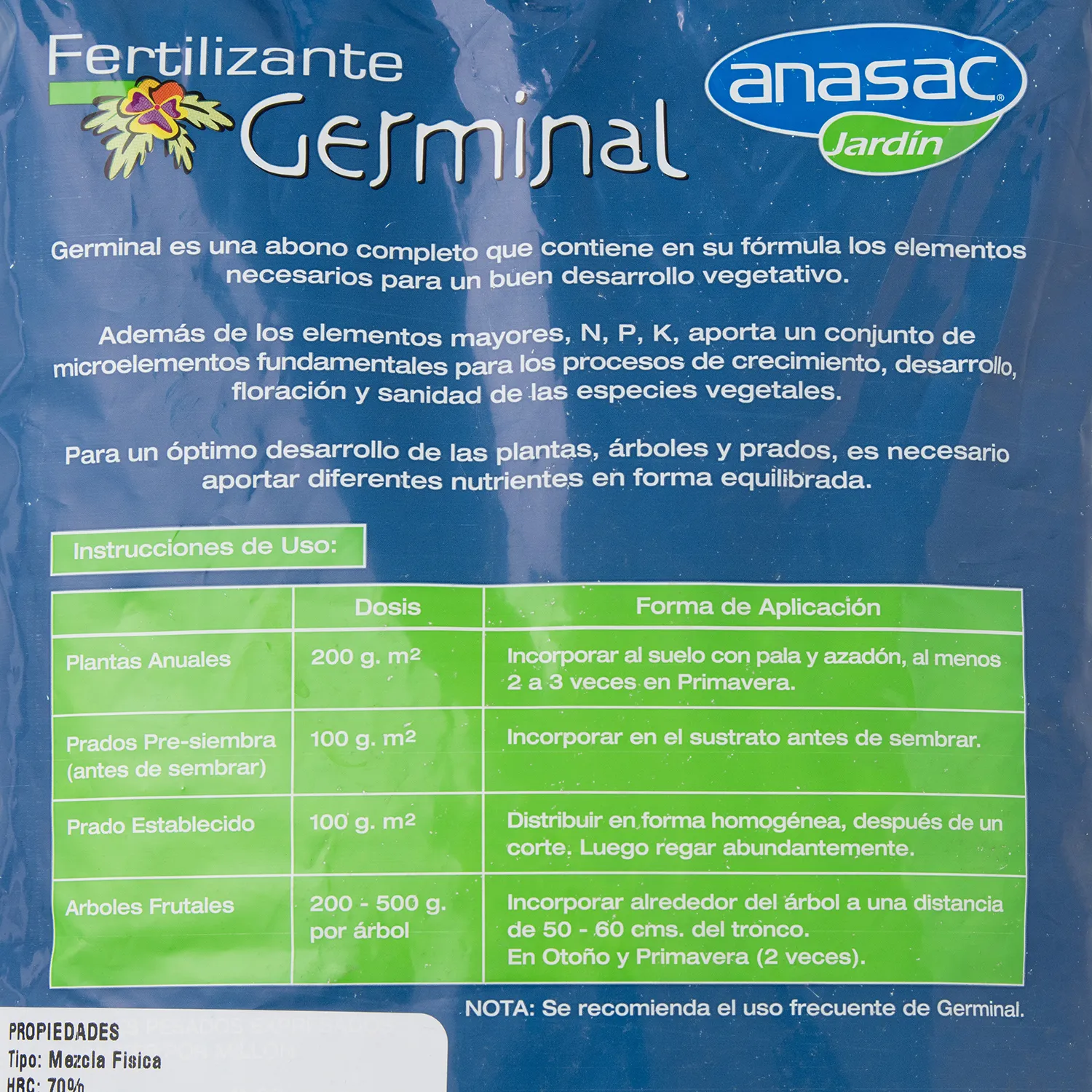 El Fertilizante Germinal contiene macroelementos (N, P, K) y microelementos esenciales para el crecimiento, desarrollo y floración de tus plantas. Su aplicación es sencilla: alrededor de plantas anuales y árboles frutales, incorporándolo con una palita o rastrillo sin dañar las raíces. En prados, distribúyelo homogéneamente después de cortar el césped o incorpóralo al sustrato antes de la siembra. Recuerda regar inmediatamente después de la aplicación. La dosificación varía según el tipo de planta: 200 g/m2 para plantas anuales, 100 g/m2 para prados (pre-siembra y establecidos), y 200-500 gr por árbol para árboles frutales.