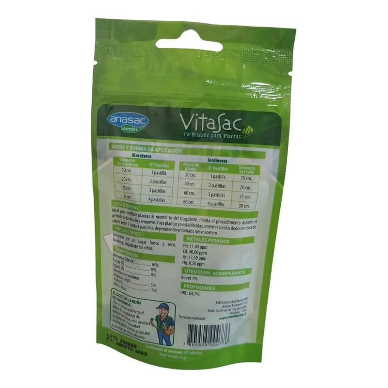 El Fertilizante para Plantas Vitasac® en pastillas, formulado para ayudar a satisfacer los requerimientos nutricionales de plantas de hoja. Fertilizante de acción continua y prolongada, libera nutrientes entre 3 a 5 semanas. Ideal para fertilizar plantas al momento del trasplante, brotación y renuevos. Estimula el desarrollo de hojas más verdes y numerosas.