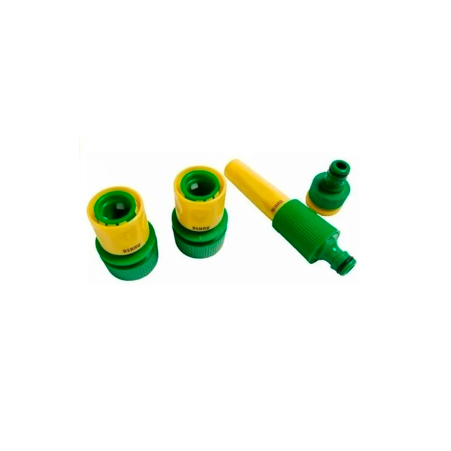 Kit de riego para manguera de 3/4″, incluye: Pitón, conector rapido de manguera con stop y sin stop y un adaptador de llave para 3/4″ y 1/2″.