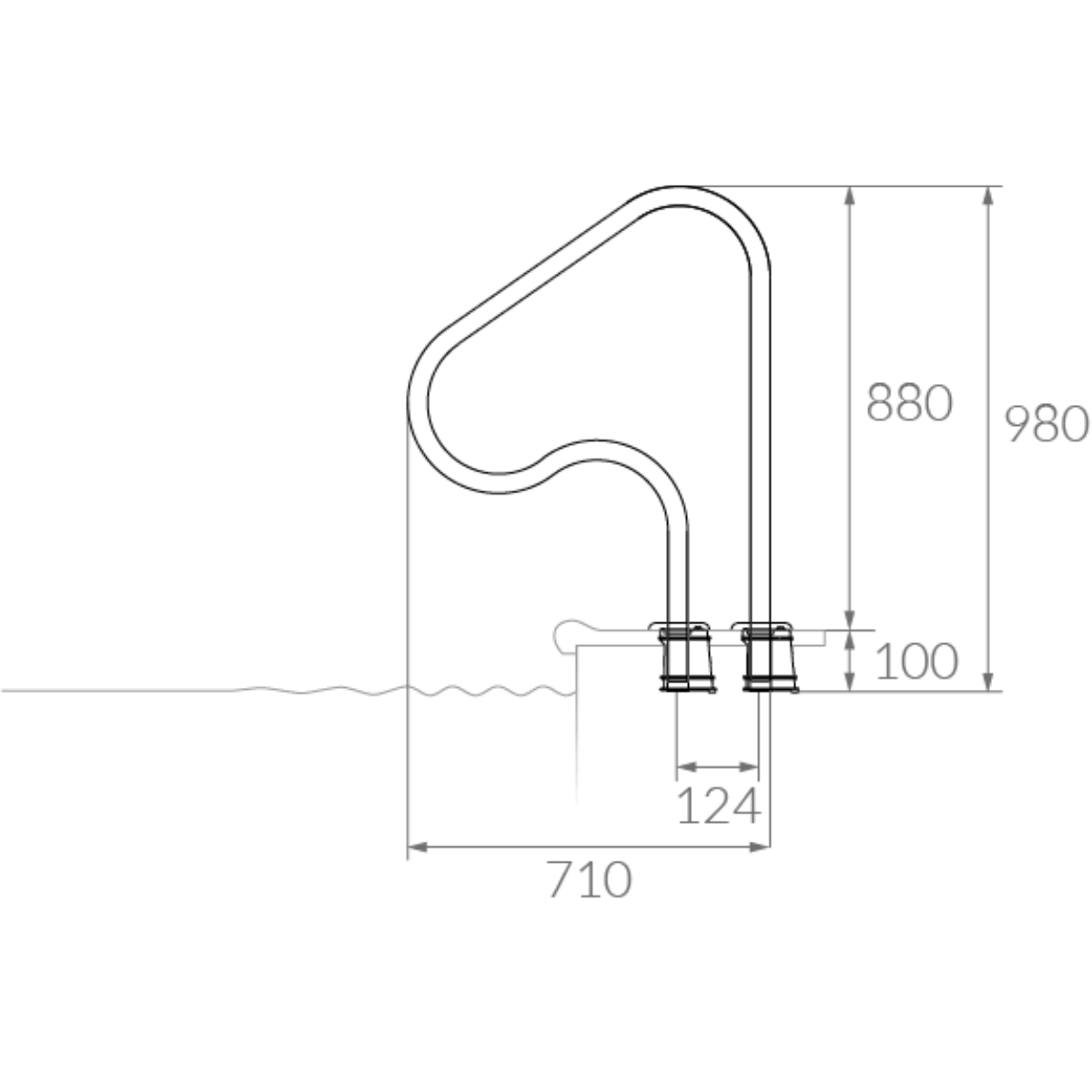 Pasamanos Vulcano largo para vereda ø38,1 mm. Fabricado de acero inoxidable 304 con terminación pulida brillante. Es un accesorio auxiliar que correctamente ubicado y fijado, permite realizar movimientos cómodos y seguros dentro de la piscina.