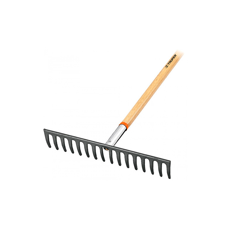 Rastrillo forjado marca truper 16 dientes. Esta herramienta es ideal para realizar limpieza y emparejamiento de terrenos para su posterior siembra o construcción.