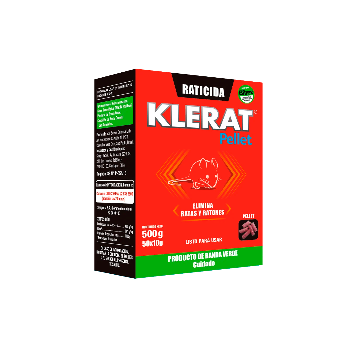 RATICIDA PELLET KLERAT® 500 gramos. Rodenticida anticoagulante para el control eficaz de guarenes o ratas de alcantarilla, ratas del tejado, lauchas o ratones y otras especies peligrosas y dañinas. Controla a los roedores con la primera dosis que ingieren, equivalente a 1,3 g en Ratas y 0,2 g en Lauchas y no produce rechazo al cebo, ya que la muerte de los roedores ocurre a partir del tercer día de la primera ingesta. Contiene Bitrex®, amargante que previene la ingestión humana accidental, aumentando la seguridad en su uso y no siendo detectado por los roedores. Fabricado por Syngenta Veneno RATICIDA Plaga objetivo Rata gris o guaren – ratón domestico o laucha – rata del tejado Marca KLERAT Uso Doméstico Contenido 500 gr 50 x 10 gr Formato Pellet Presentación Listo para usar Inflamable No Ingrediente activo Brodifacoum 0,005% Clasificación toxicológica OMS IV Banda Verde Temperatura almacenamiento Ambiente Amargante SI Registro SAG SI Registro ISP SI *Lea atentamente las instrucciones de uso, recuerde instalar el producto dentro de una trampa como por ejemplo un tubo cebadero.